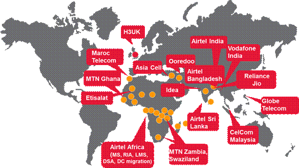 such as, Vodafone, Airtel, MTN, Orange (France Telecom) and Etisalat, providing services through group wide